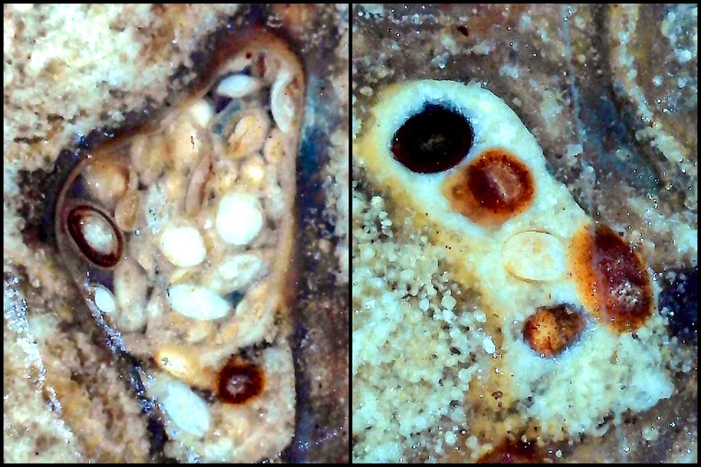 This allowed them to form three dimensional “microbe cities” that took knobby shapes. The top image shows the irregular outer surface of this small stromatolite. The middle image shows the interior with its wavy, layered appearance. The lower, microscopic images show structures within this mat.
