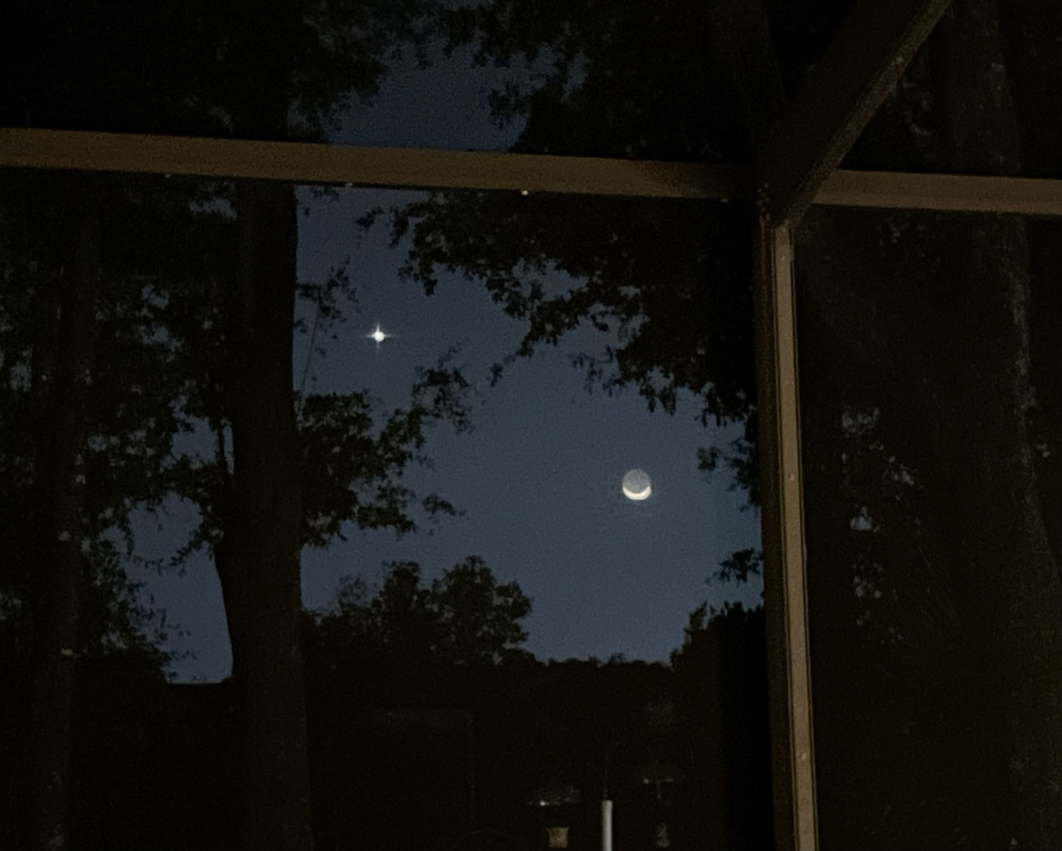 The “old Moon” rests “in the arms” of a new, grinning, crescent Moon with earthshine illuminating the portion of the Moon that is shadowed from direct sunlight. Above and to the left, Venus adds to the beauty of the scene like a supportive sibling, the sister of Moon and Earth. Indeed, they are all brothers and sisters in the same solar family.