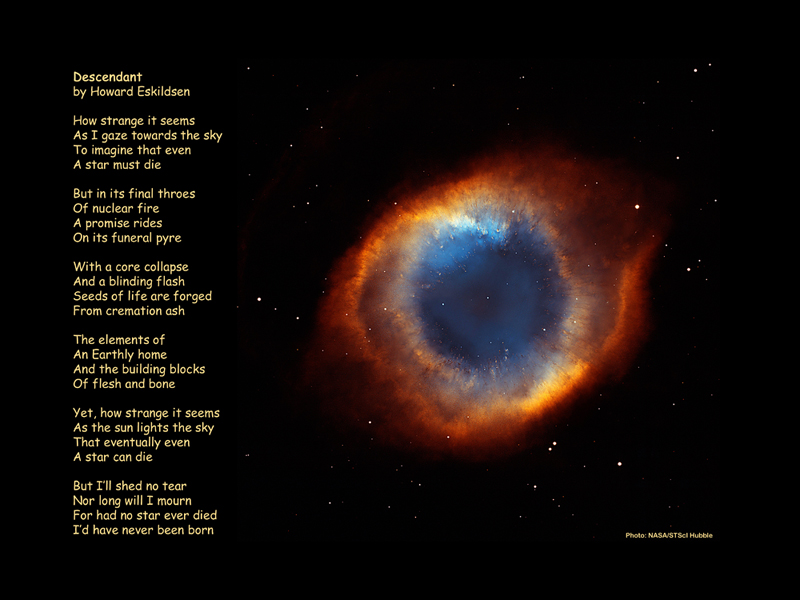 The poem was inspired by the loss of a friend who had shared and encouraged my astromomy interests. Not only did the poem provide an emotional outlet, it brought me to a realization and acceptance of the terms of our existance.