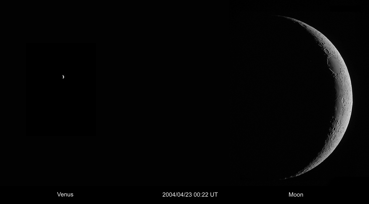 The Moon and Venus blinked through branches as I made my way across the front yard to a spot near the street where they came into full view above the trees. I photographed the thin, crescent Venus as it gleamed in the twilight above the western tree line. Next I turned the telescope and camera towards the crescent Moon a few degrees farther east. I barely had it focused when a voice called from the street, “Hi, what are you looking at?”