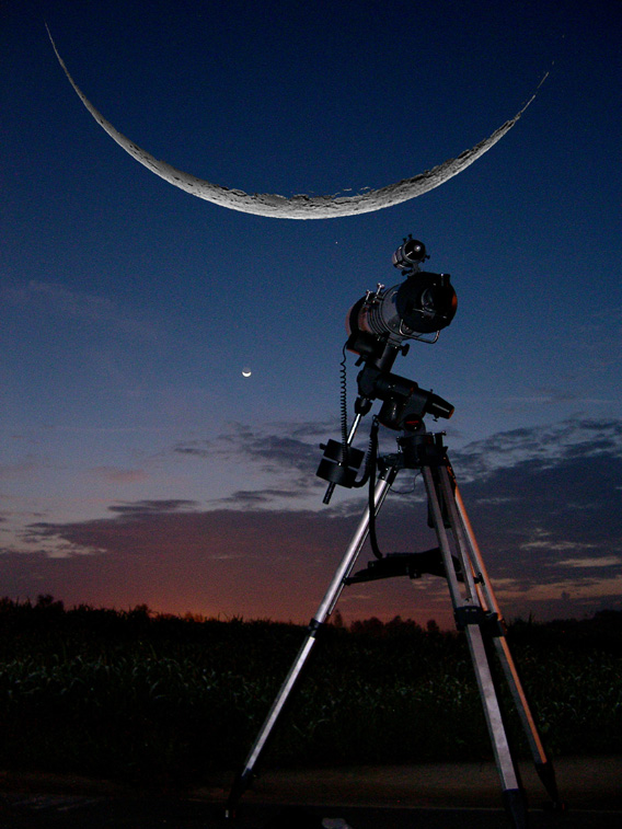 After an early morning imaging session with the six-inch refractor, a photo opportunity appeared, and I took the picture of the scope and Moon in the distance. Later the telescopic image of the Moon was emplaced over the upper image. In the distant past the Moon was much closer to Earth and appeared much larger, though probably not this large. Over time it has moved away due to tidal effects and will be much smaller in appearnce eons from now.